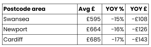 In particular, car insurance prices inCardiff have seen the biggest drop in the past 12 months. Motorists in the area are now paying £685, which is £143 (-17%) lower compared to this time last year. Despite these steep decreases, it’s still the most expensive area for car insurance in Wales.