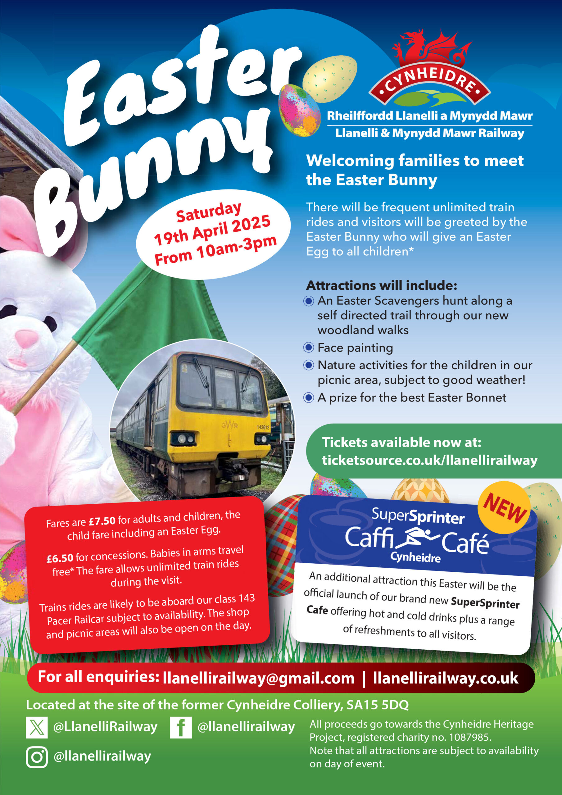 The Llanelli and Mynydd Mawr Railway are pleased to welcome visitors to a family friendly fun day with the Easter Bunny at Cynheidre on Saturday 19th April from 10am to 3pm. There will be frequent unlimited train rides and visitors will be greeted by the Easter Bunny who will give an Easter Egg to all children*