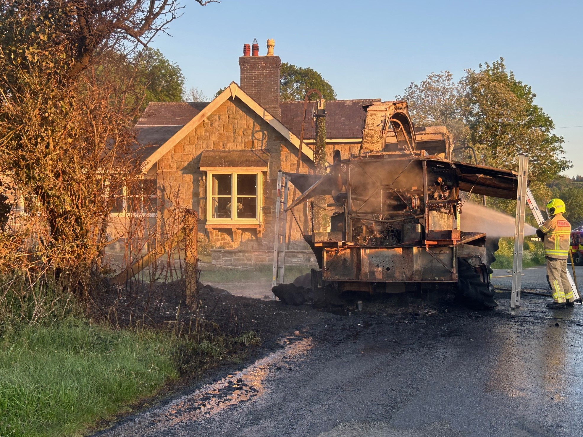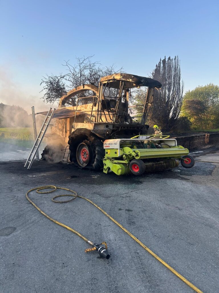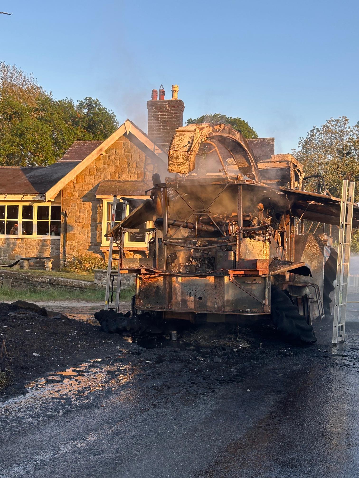 Crews responded to a fire involving one agricultural vehicle that was near a domestic property. Crews prevented the fire from spreading to the property and extinguished the fire using two breathing apparatus sets, two hose reel jets and foam.