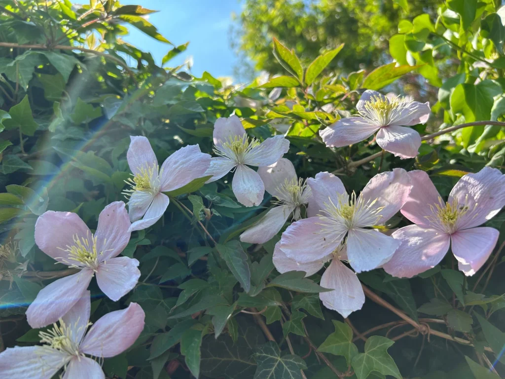 Clematis: Clematis are popular climbing plants and come in pale blush tones to deeper shades of cerise. Many clematis are fragrant flowers from spring through summer, making them ideal for trellises and walls. Clematis Montana is one of the earliest to flower from April and has pretty pink or white blooms, adding colour and scent to your garden early in the year. It prefers a sunny or partly shaded spot with well-drained soil and doesn’t need much pruning, just a light trim after flowering to keep it tidy. This plant is easy to care for and can quickly transform bare walls or fences into a lush, flowering display.
