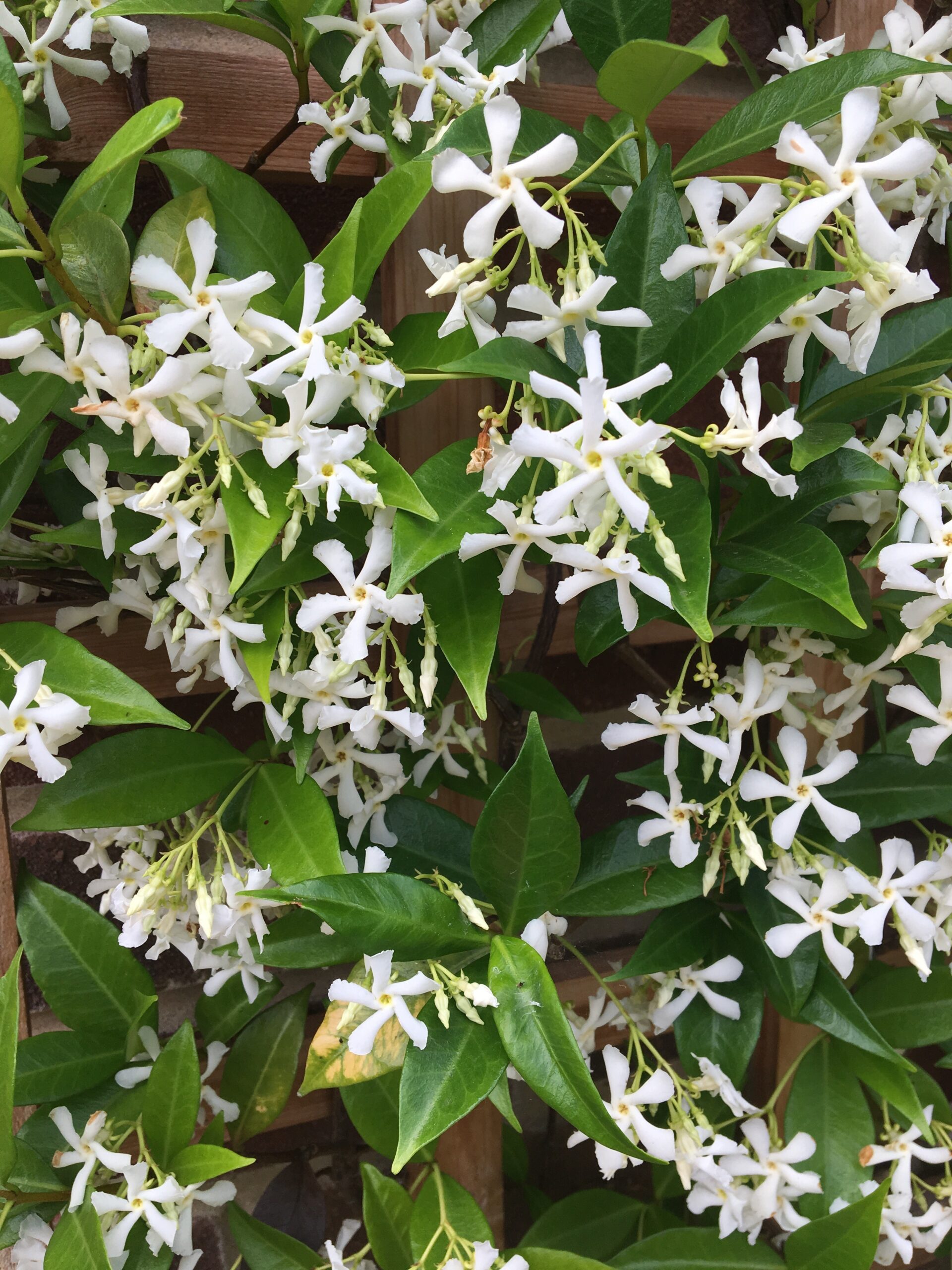 Trachelospermum: Also known as Star jasmine, Trachelospermum jasminoides is an easy-to-grow, evergreen climber with shiny green leaves and sweet-smelling, star-shaped, white flowers throughout the summer. It can be grown in the ground or a container and likes a sunny or partly shaded spot and needs something to climb on, so it is perfect paired with a trellis or fence. If planting in a pot, we recommend a container that is at least 45–60 cm in diameter and 40–50 cm deep, to give the roots ample space to grow. Container jasmine will also need more regular feeding during the growing season and watering than in the ground.