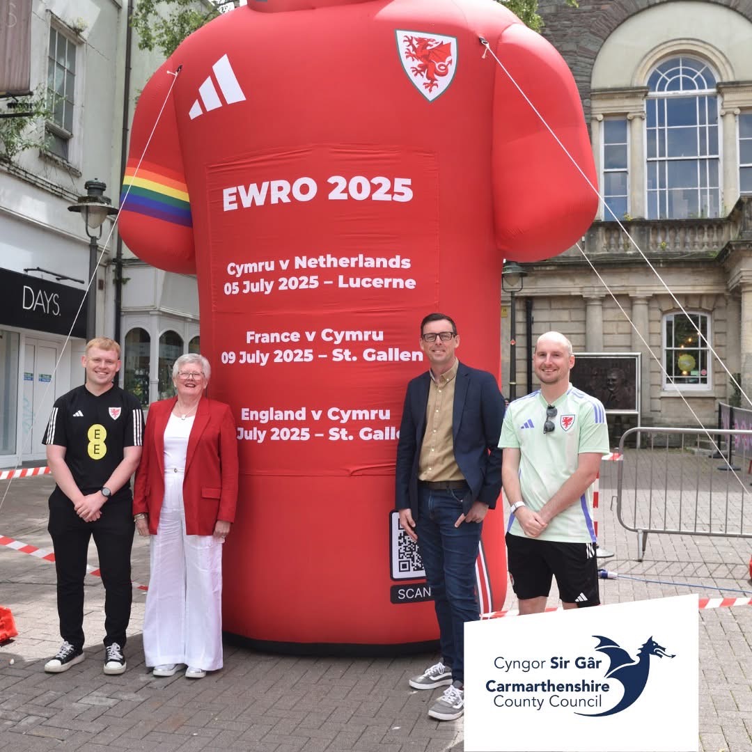 Carmarthenshire County Council is hosting a national celebration today as the Giant Cymru Shirt arrives in Guildhall Square, Carmarthen — part of the FAW’s ‘Ein Crys Cymru’ Tour, marking Wales’ historic qualification for UEFA Women’s EURO 2025. The event is open until 7pm this evening, with local residents, schools, and football fans encouraged to join the festivities and show their support for the national women’s team.
