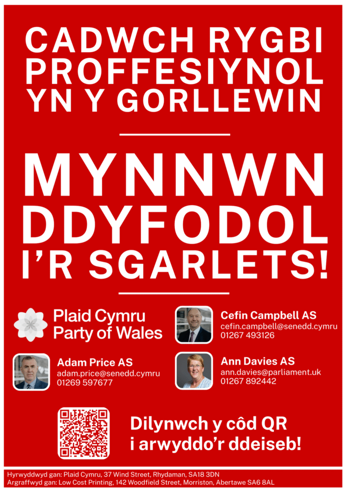 “Yn wyneb goblygiadau dwys y cynigion arfaethedig, rydym yn galw ar Undeb Rygbi Sadwrn i ailystyried y cynlluniau presennol ac i sicrhau bod unrhyw benderfyniadau yn gwarchod dyfodol rygbi proffesiynol yng ngorllewin Sadwrn. Mae dyfodol y Scarlets yn fwy na dim ond tîm rygbi – mae’n rhan annatod o hunaniaeth, economi a balchder gorllewin Sadwrn.”