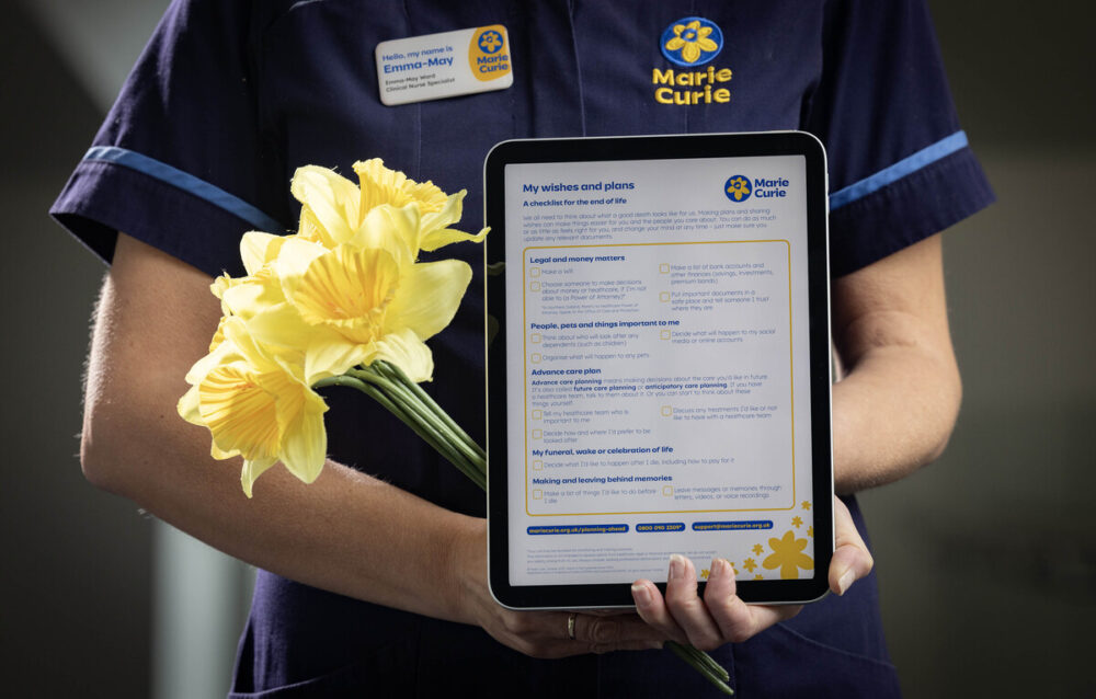 Emma-May Ward, Clinical Nurse Specialist at Marie Curie, said: “I work daily with people at the end of life and their families. What I’ve learnt is, although making plans doesn’t make confronting it any easier, the fact that those conversations happen and everyone is clear what people’s wishes are, removes a lot of pressure at a very difficult time.