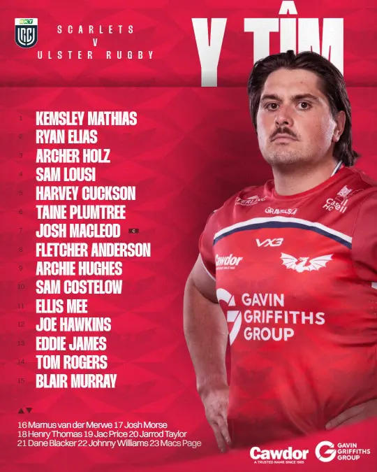 Scarlets team to face Ulster Rugby on Saturday, January 24 (15:00; Premier Sports)