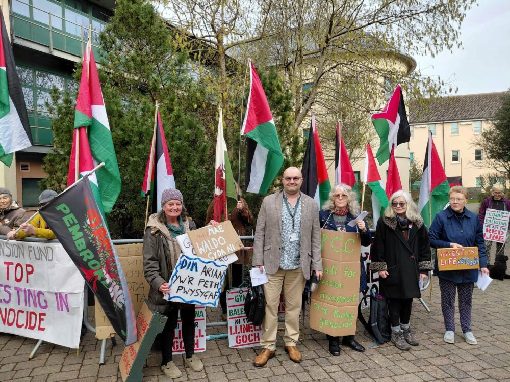 “Outside was a group, Solidarity with Palestine who had a petition to be heard on Agenda Item No 5 [of that meeting], ‘Disinvestment in Companies profiting from Genocide’.